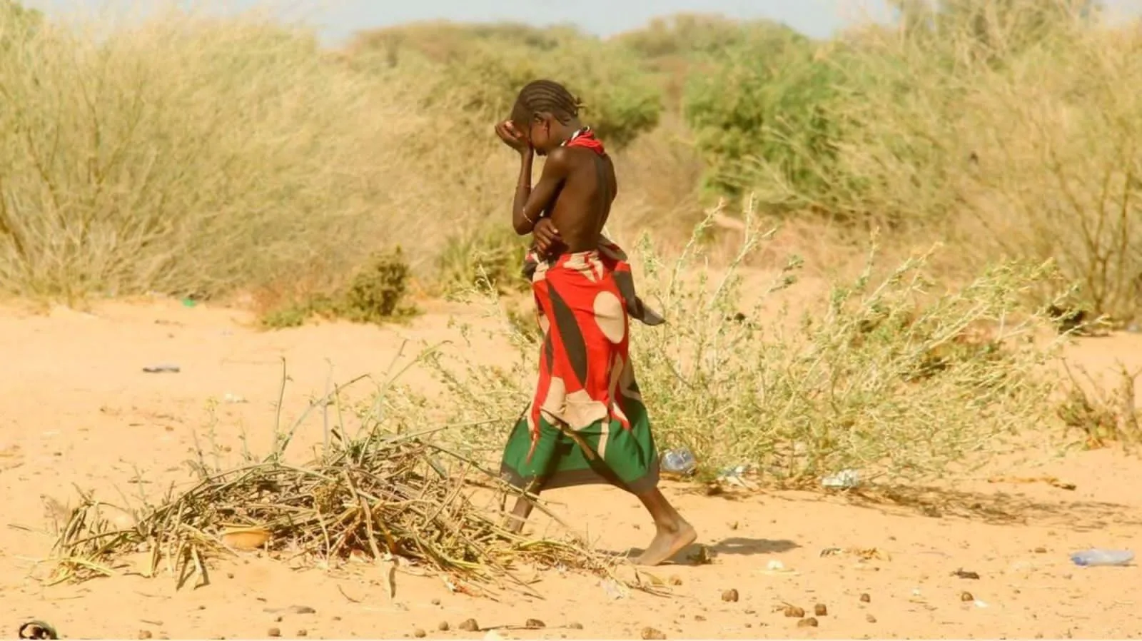 Eleven-year-old Akai wore the flag like a dress — not sewn, just wrapped clumsily around her thin frame, pinned at