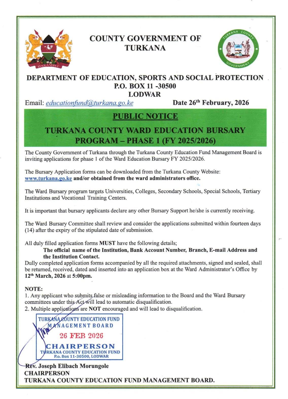 The public notice was signed by Rev. Joseph Elibach Morungole, Chairperson of the Turkana County Education Fund Management Board.