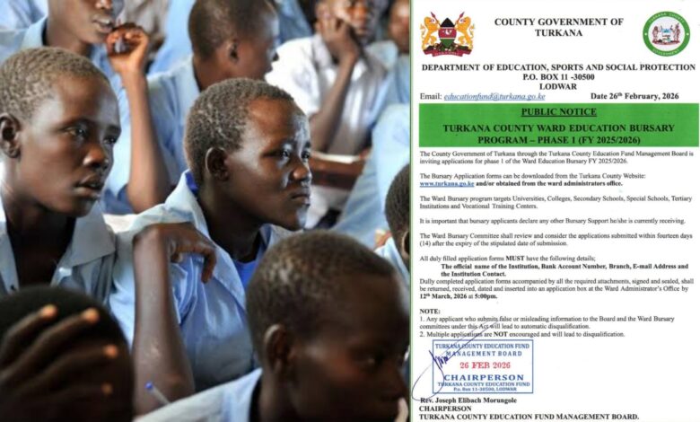 According to the notice dated 26th February 2026, the bursary program is being administered through the Turkana County Education Fund Management Board.