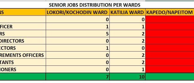 Recent job distribution data he shared on his platform shows a glaring disparity in employment opportunities. While Katilia Ward has 10 senior county employees and Lokori/Kochodin Ward has 7, Kapedo/Napeitom Ward has been allocated only 2 positions.